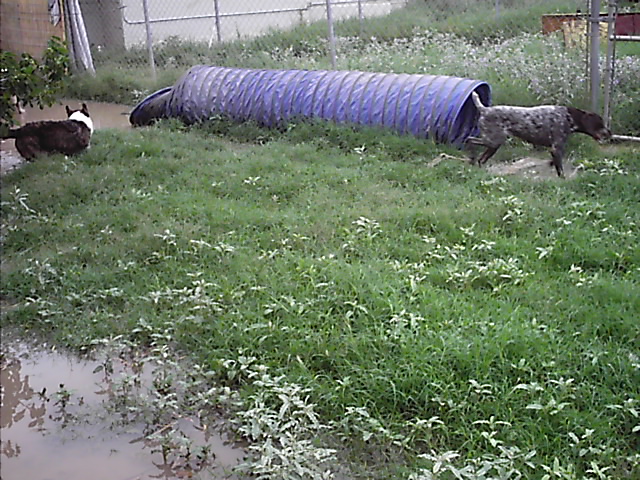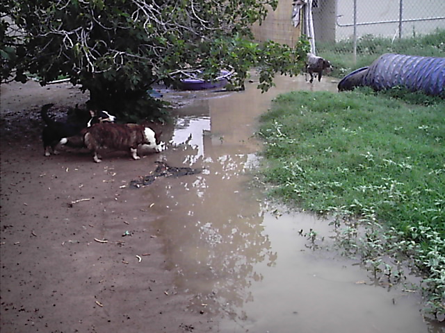 You wouldn’t think that in far Southwest Texas would have be effected by a Hurricane but we are having a weather event. The weather channel radar shows rotating clouds just like a coastal storm. We have had almost 3 inches of rain over night and more is expected. July is Monsoon season so we have had a lot of rain prior to this so the ground was already wet and the grass was already HIGH! El Paso’s annual rain fall is under 10 inches and we have had over 20% of our annual total in the last 48 hours. I live in the desert because I don’t like rain so I’ll be happy for it to move along. The dogs will be too. Windy aka The DIVA has to be tossed outside, she won’t go out on her own. The Cardigans are so low to the ground that they have to wade to the high ground and they are covered in MUD. Henry likes the mud but Lindy and PJ would just as soon stay out of the high water. Wicca in true bird dog fashion just gallops thru it. Stoney will go out since he lets nothing stop his barking at the world.
