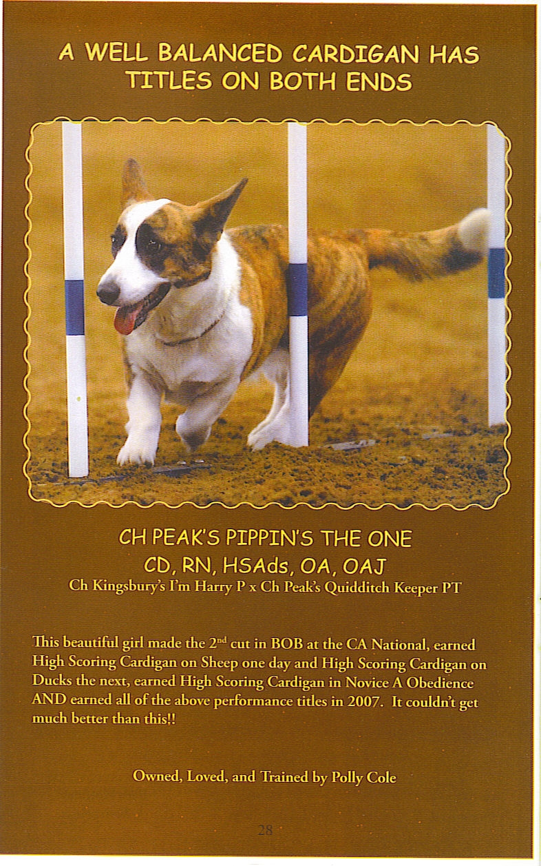 If you aren’t familiar with the titles the are AKC Agility Excellent (AX) and the VCX is the CWCCA’s Versatility Excellent Certificate (VCX), a Cardigan must obtain a title in three of the five areas listed Conformation, Obedience, Tracking, Herding and Agility with one at the Basic Level or higher, one at the Intermediate Level or higher, and one at the Top Level.