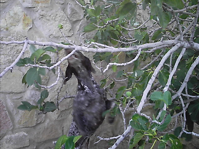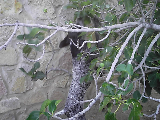 I’ve been trying all summer to get a photo of the fig harvest. We have a large fig bush in our yard. It is really old and the figs are the big green figs. We have had so much rain that our fig crop has been bountiful. All the dogs love the figs but Wicca is a fig freak! Wicca will often pull the branches down and the short dogs will grab hold. It is a team effort.