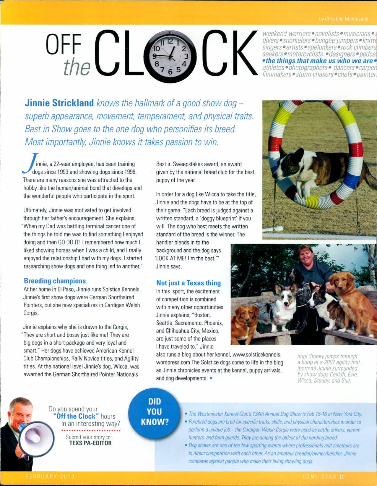 The Solstice dogs were featured in my Company magazine this month. This is an employee magazine for all of Texas and the writer who did the feature did a great job, didn’t make me sound too crazy or our sport sound silly.