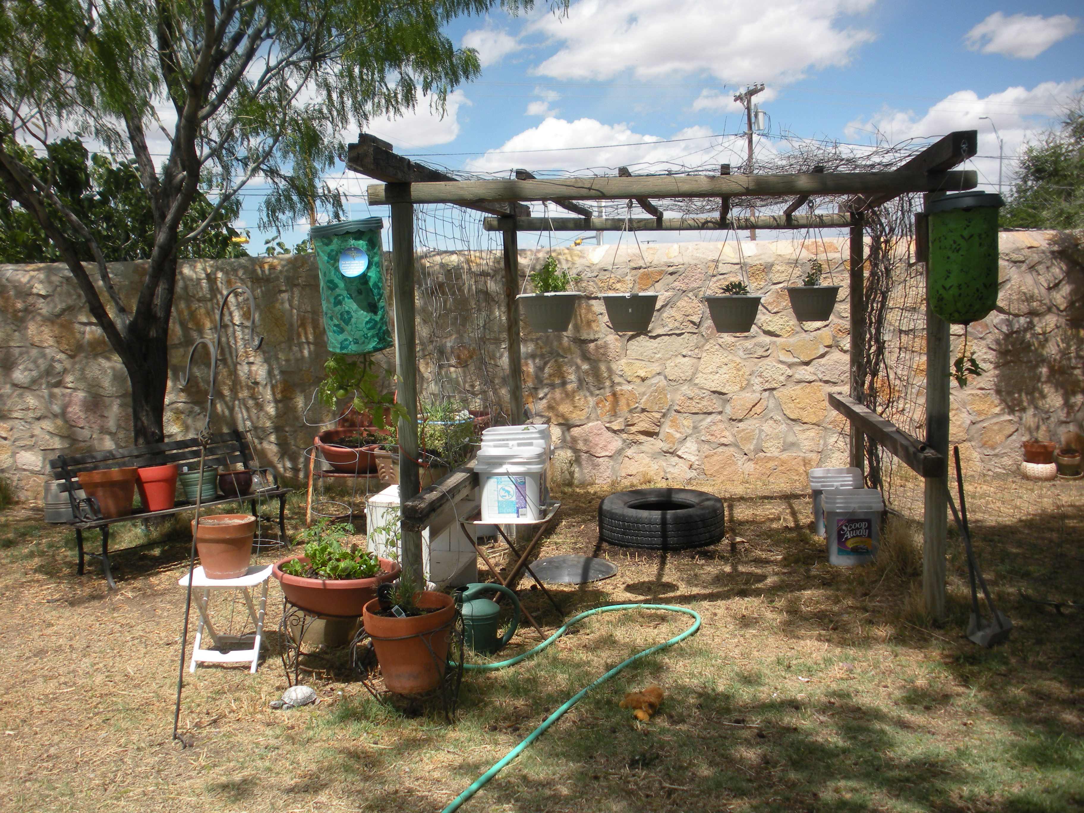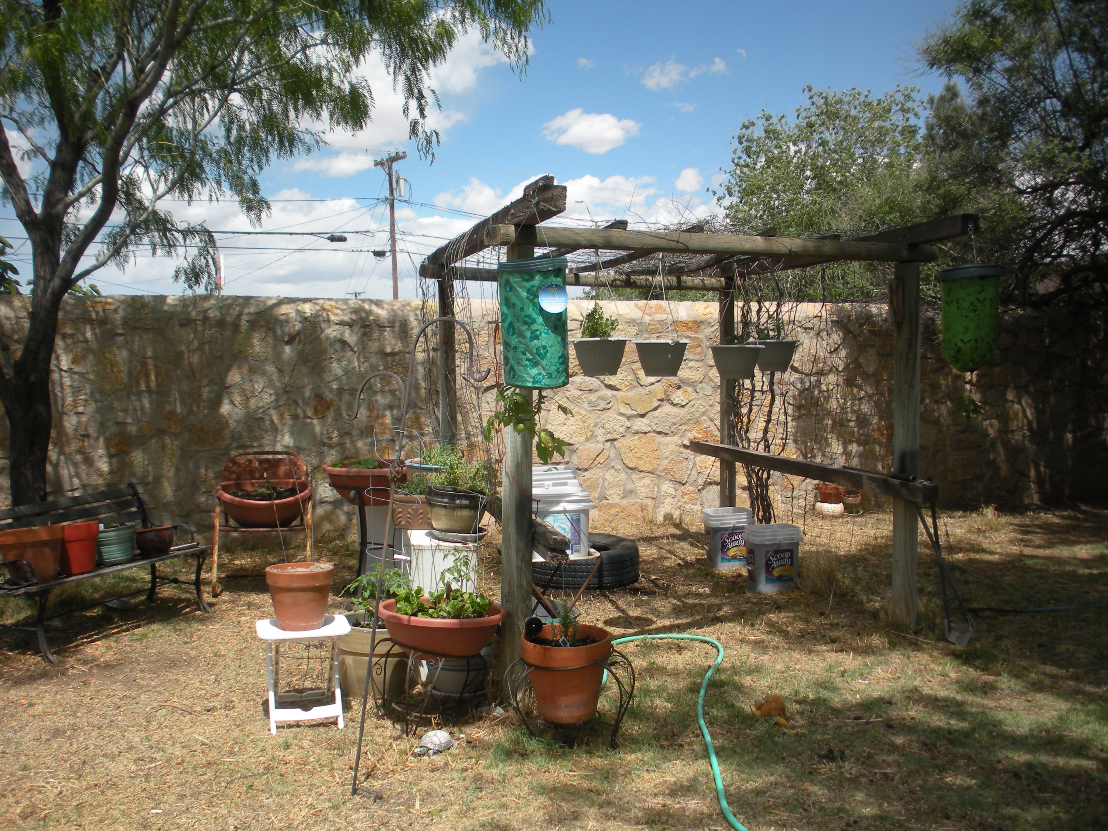 Here is my garden, we recycled kitty litter containers for the pots and the old tire HAD Watermelon for Watermelon Sunday planted but the “helpers’ helped themselves to the lovely dirt to dig in and ate some of the plants with young veggies already on them. I had to put some of the plants up higher to keep the walking recyclers from eating the goodies.