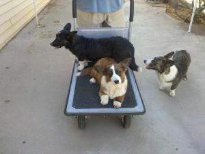 Actually it is a game we play with the dolly cart. They all like to ride and I push it up and down the walkway and the all try to ride. This is Banner and Mandy riding and Bailey trying to get her turn. Once 4 of them were on the cart riding. It makes me laugh everytime which is of course why I do it.