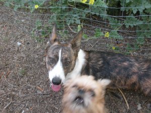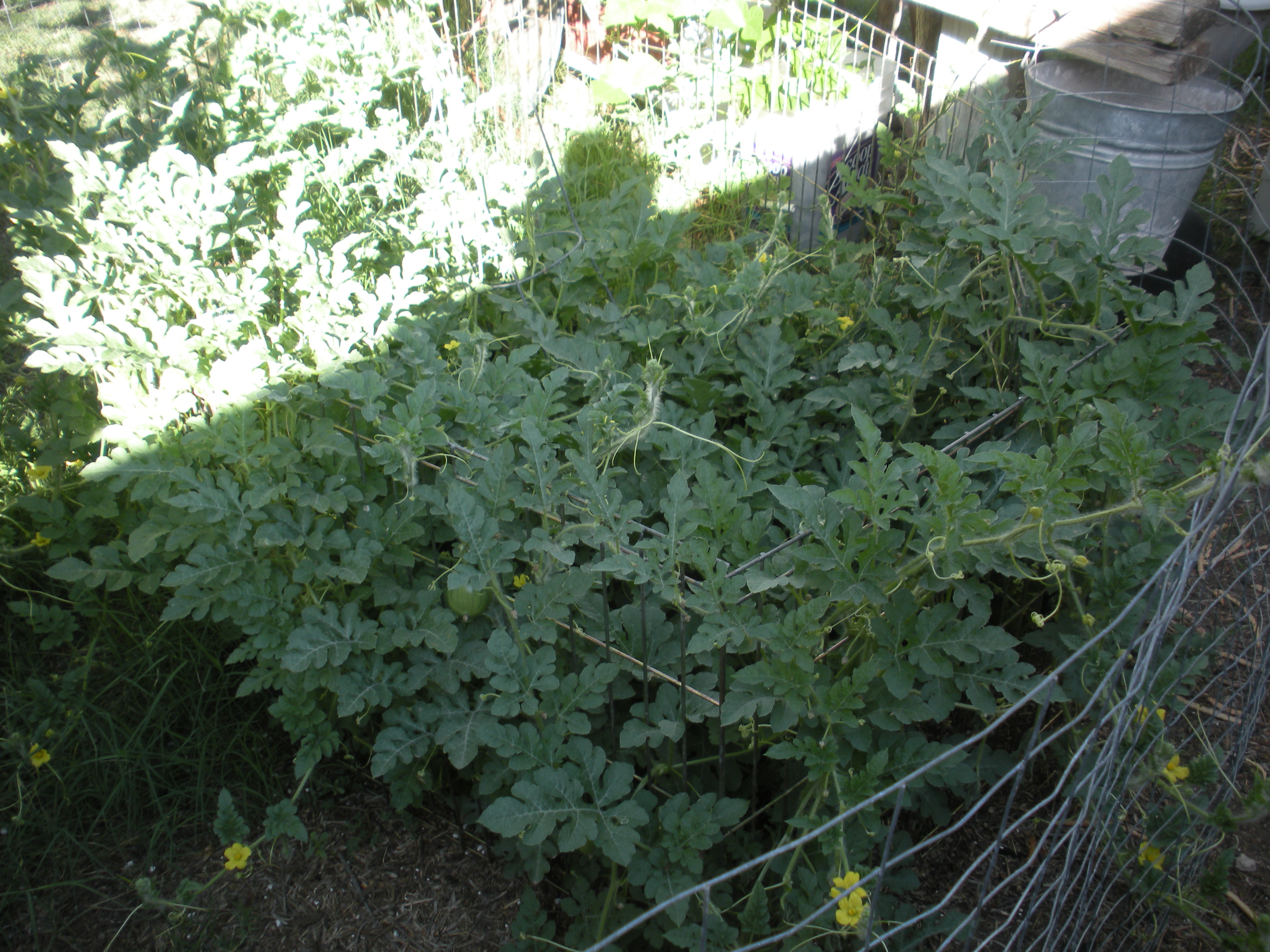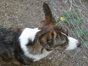 So Monday I’m working in the garden and I’ve been admiring the fist size watermelon that is growing in the watermelon patch.  Bailey and Sienna were hanging out.  I went in the house and when I came out the melon was laying out in the yard.  Who do you think did it?  Now granted I planted the watermelon for the dogs but the key is dogs with an “s”.  Not Bailey.  Is she guilty?