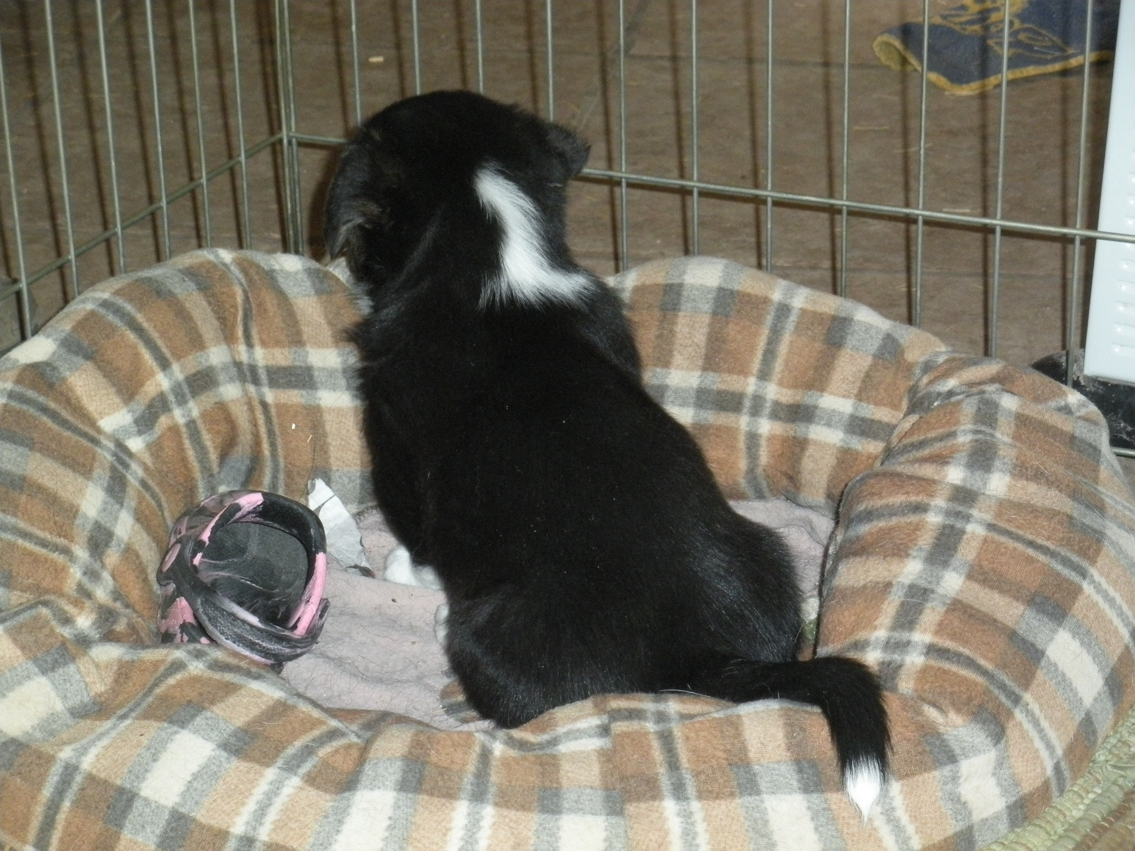 I sat on the stool in the puppy pen this morning with my camera thinking maybe I could get some photos of the puppies when they weren’t sleeping. I wasn’t very successful. Really, the camera is just too slow. Most of them were blurs, bites, blobs or empty frames. Sorry to all you Nog fans but he spent most of the photo session attached to my pant leg or one of his sisters so I’ll have to try again later for Nog feature.
