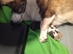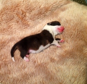 Baby Boy is doing well. Doing normal newborn things eating, sleeping, pooping etc. Frost is an excellent Mommy Dog, she is doing a great job. He saw Dr. Robin yesterday for dewclaws and a checkup of mommy and baby dog. He is pretty active, he has lots of room to move around in the box and he does he is all over his domain.