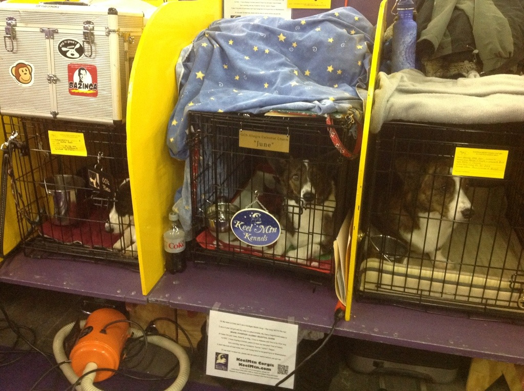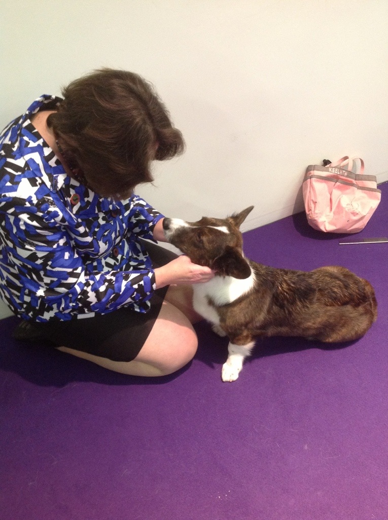 What we did after the judging. (we did run out to find some lunch in a neighborhood (Hell’s Kitchen) bar and grill, while other Cardi folk kept watch for us). June did a great job on breed PR.