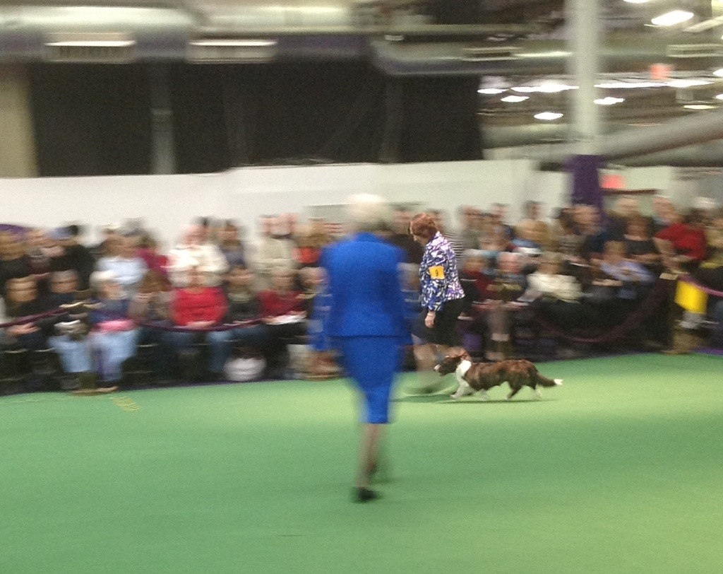 After the Cardigans showed I did my best to bossily herd the Cardi exhibitors to the logo for a photo op! I’m betting there were not a lot of other breeds who could get it together for a group photo. Cardi folks are the best! There were a few missing but in the chaos of the event I was happy to get this many of us together. We are missing Team Coco as she was off doing her official BOB winner duty. This was hilarious, as once I started taking photos the paparazzi showed up and we had a dozen or so people taking photos and others holding back the crowd so we could get clear shots.