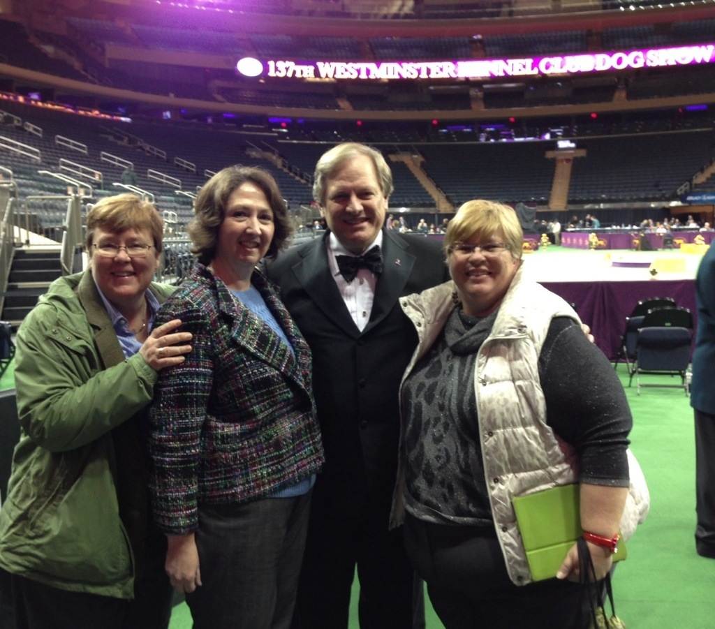 It was a great experience for us, Leslie and June made me proud! The Cardi people were amazing! The entire WKC team made the whole thing easy and fun. To just add to the experience we were very excited to meet one of the great people in dogs, David Frei the TV announcer for the WKC, National Dog show, AKC Judge, Owner Handler and author of “Angels on a Leash”. David is one of our Champions and he is so appreciated as he tells our story and his support of Dogs, Breeders, Owner Handlers, Handlers, Judges and responsible dog owners everywhere! He was so gracious to take a few moments of his time on a busy night to do this photo op with Leslie, Clair Ward and myself. Thanks David!