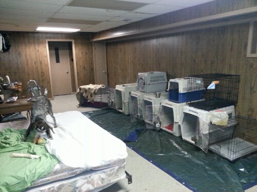 Dog world is starting to take shape. 1/2 of the basement is finished (with A/C and heat) and the other 1/2 is set up for storage. Lots and Lots of stuff in the storage area but it is getting better everyday. I know I need a crate intervention. I have about 3-4 crates per dog (or that is what I am admitting to having,) some people have shoes, I have crates. This is a walk out basement so the dogs have access to the yard from the basement. In addition to AC, they have cable TV, a bed and a fridge and microwave. Actually some of that is for the people in case we have to go down for storm purposes.