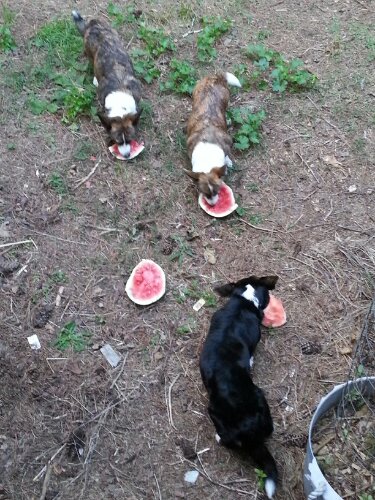 Dogs are happy to still have a fig tree, they are picking them green. They want to make sure they beat the birds. This one has a lot of low hanging branches, perfect for Cardigan harvesting. Wicca can reach a bit higher.