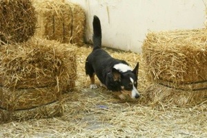 Now Lindy, has very limited exposure to Barn Hunting and has had no practice at all but since I wanted to go I took her along. She very successfully found her rat in the instinct test and earned her RATI and during the actual Novice runs she found her rat very quickly but failed to do the climb element. I can teach her to climb straw bales, but I can’t teach instinct so I am OK with that. She had fun and I was proud of her good work. Silly Momma dog!
