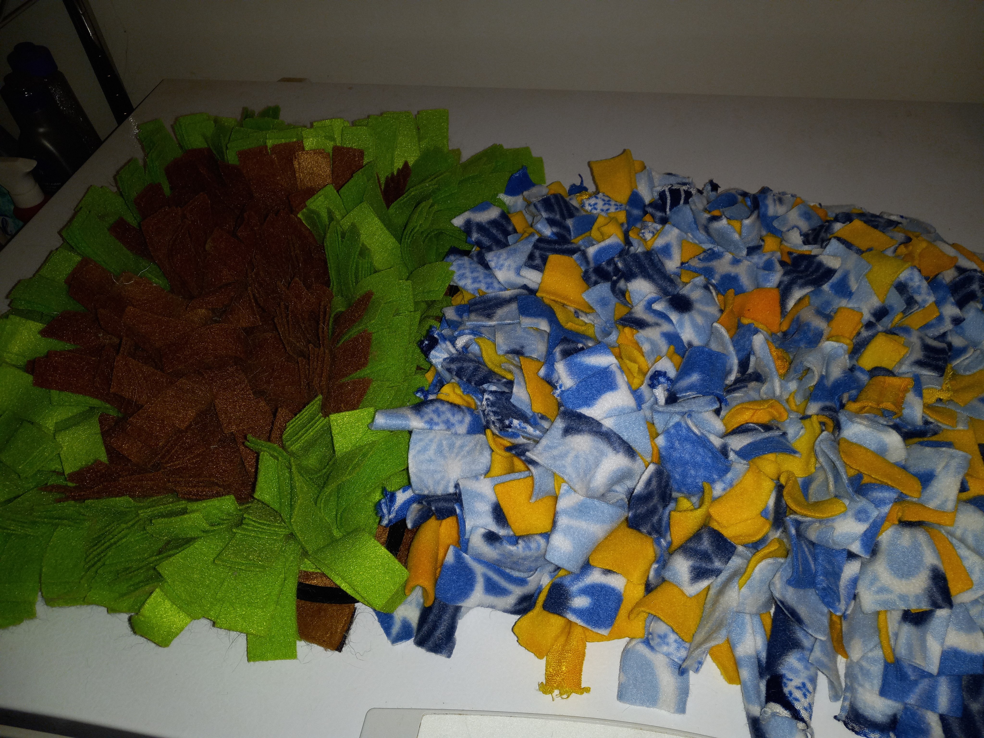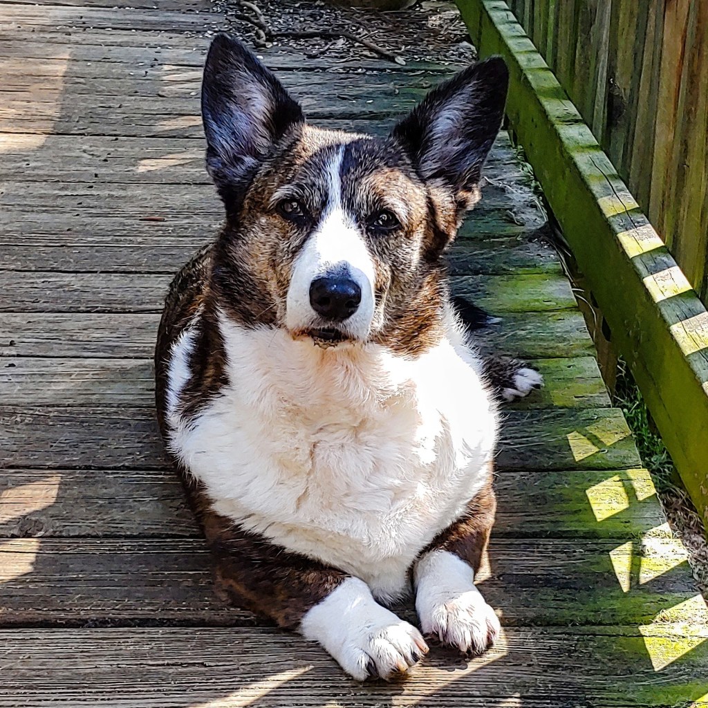 All of that sort of lead into what was I doing for the big dogs. Like almost all Cardigans the senior crowd (and Cali) are strongly motivated by food and my dogs particularly enjoy fruits and veg. Anyone who has hung around our Solstice site has seen many photos of the infamous Watermelon Sundays. We have expanded on that with the “enrichment zone”. We have a high deck and we toss fruit and Veg off the deck into the grass zone and sniffing and eating commence (they look like grazing cows). The Enrichment zone gives the dogs a reason to go out and sniff. Sniffing really engages their brains and to find the treats they not only have to use their senses but it is a competition too. We are currently working on our Sensory Garden too, we are getting lots of ideas from the Facebook groups Canine Enrichment and Sensory Gardens for Dogs. We have our slide and kiddy pool, agility tunnel and we recently cut down a tree so adding some logs as soon as we can get them in position and I am working on a scentwall to use for fun and Scentwork training.