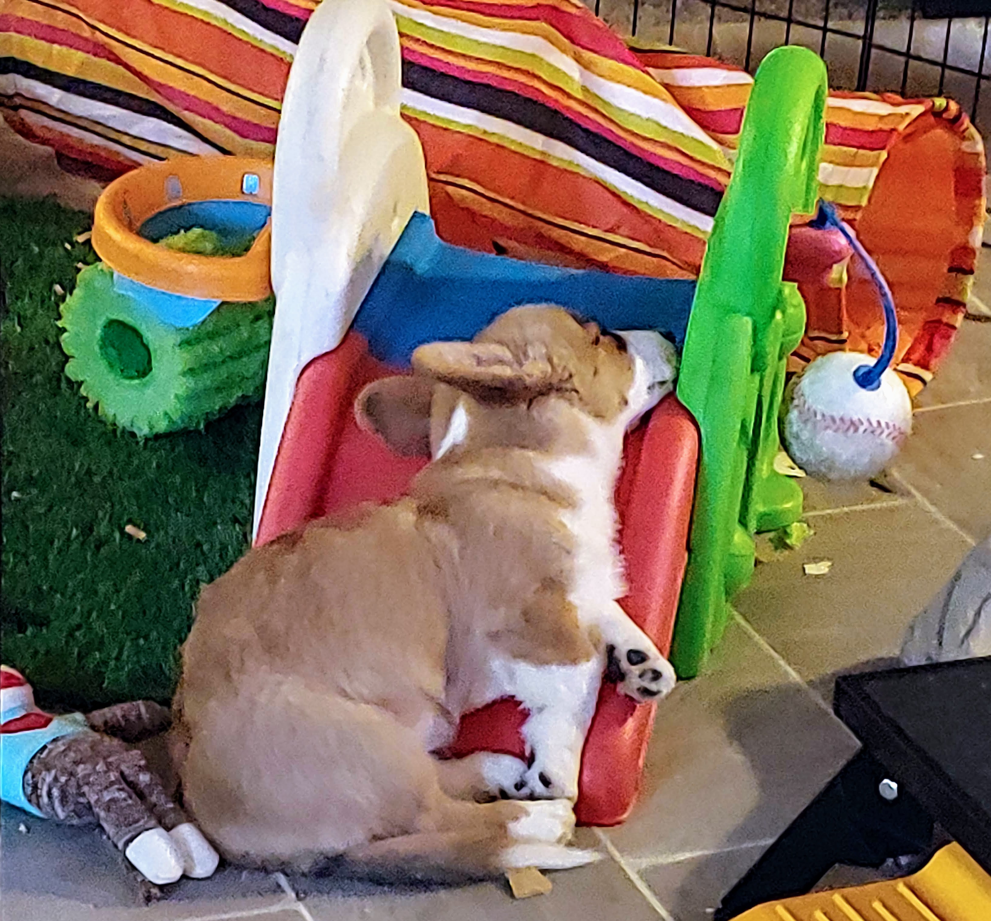 During his baby puppyhood, we started on enrichment, different toys and activity centers, ramps, surfaces, and platforms, and of course his beloved baby slide. As he got older we did puzzles and snufflemats and ball pits. I am proud to say he has a great temperament and is a smart brave boy with an outstanding outlook on life and his own social media fans.