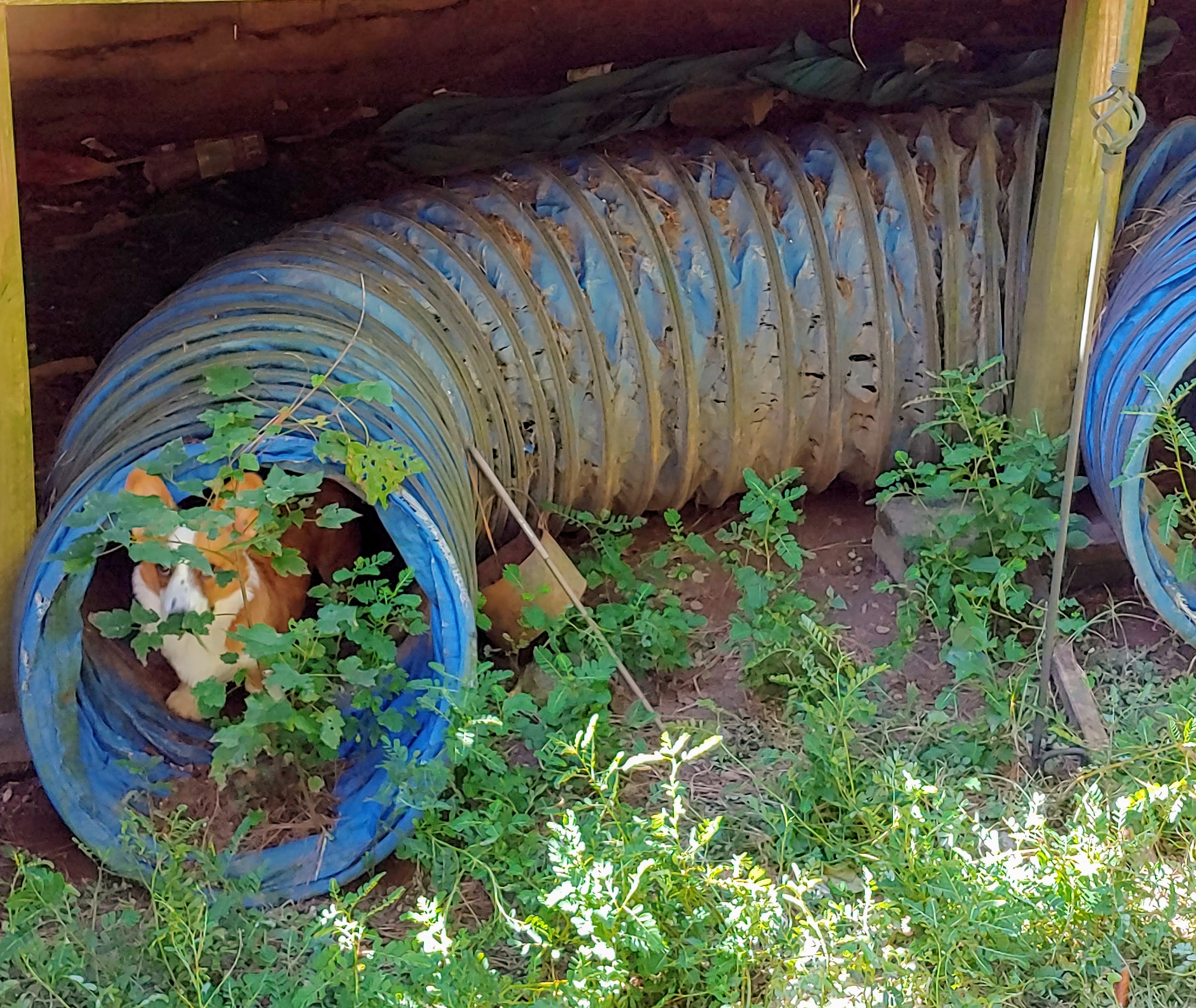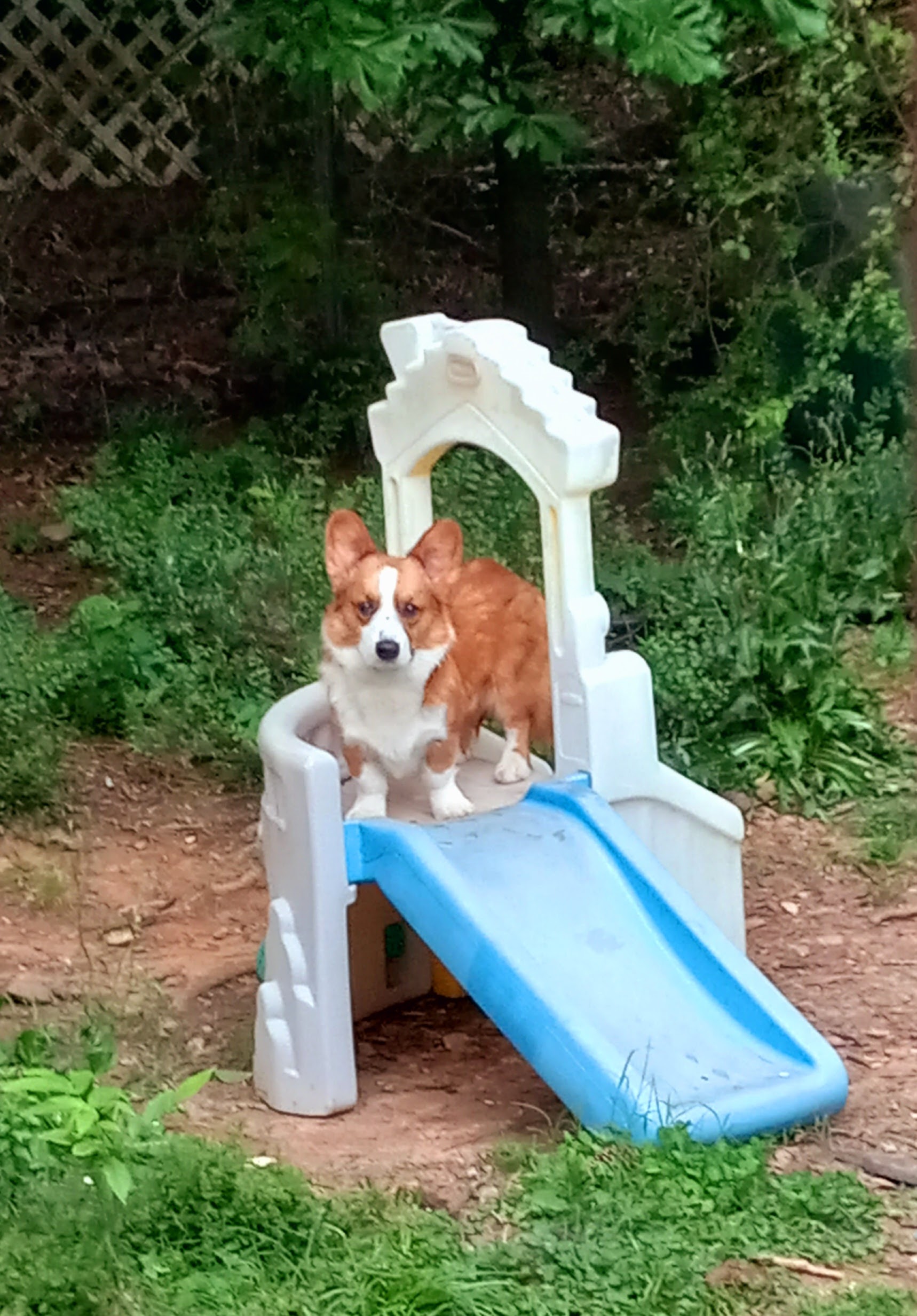 All of that sort of lead into what was I doing for the big dogs. Like almost all Cardigans the senior crowd (and Cali) are strongly motivated by food and my dogs particularly enjoy fruits and veg. Anyone who has hung around our Solstice site has seen many photos of the infamous Watermelon Sundays. We have expanded on that with the “enrichment zone”. We have a high deck and we toss fruit and Veg off the deck into the grass zone and sniffing and eating commence (they look like grazing cows). The Enrichment zone gives the dogs a reason to go out and sniff. Sniffing really engages their brains and to find the treats they not only have to use their senses but it is a competition too. We are currently working on our Sensory Garden too, we are getting lots of ideas from the Facebook groups Canine Enrichment and Sensory Gardens for Dogs. We have our slide and kiddy pool, agility tunnel and we recently cut down a tree so adding some logs as soon as we can get them in position and I am working on a scentwall to use for fun and Scentwork training.