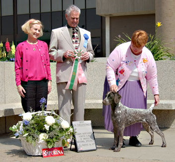I learned so much from all these great dog clubs that when it came time to find my first show dog, I had enough credentials that my eventual mentors took a chance on a newbie and sent a fabulous puppy all the way across the country to a new show home. As a proud owner of not just my pet GSPs but now of a show puppy I also joined the GSPCA the parent club for the German Shorthaired Pointer. I finished my beautiful Windy completely Owner Handled and bred my first litter which produced my lovely Wicca who was the 2003 GSPCA Best in Sweepstakes (entry of 99).