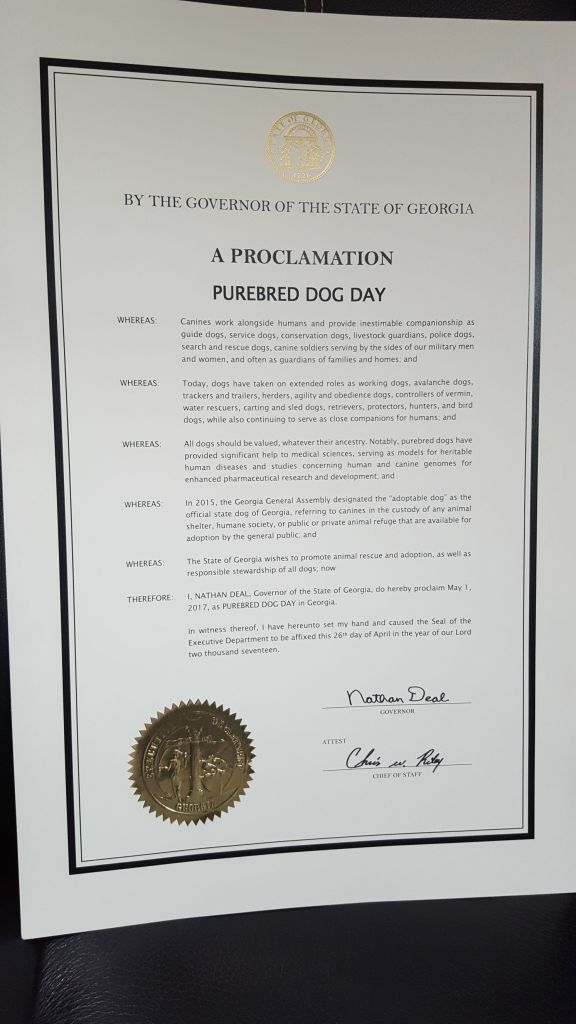 Here in Georgia, I have also served as an officer and board member of the Georgia Canine Coalition, an organization that works to protect the rights of dog owners in the state. I was honored to represent AOC at the Capitol when Governor Nathan Deal declared May 1st as National Purebred Dog Day in Georgia.