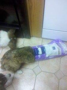 Miss Frost is an easy keeper, in other words she is PJ’s daughter and likes food a lot. She spent the summer harvesting figs and eating mesquite beans and turned into fat Frost so she was forced onto the Green Bean diet to get her waist back for the upcoming shows. Apparently she thinks she is starving and is taking matters into her own paws. This is Sienna’s empty bag of dog food, there just might be some food dust in there.